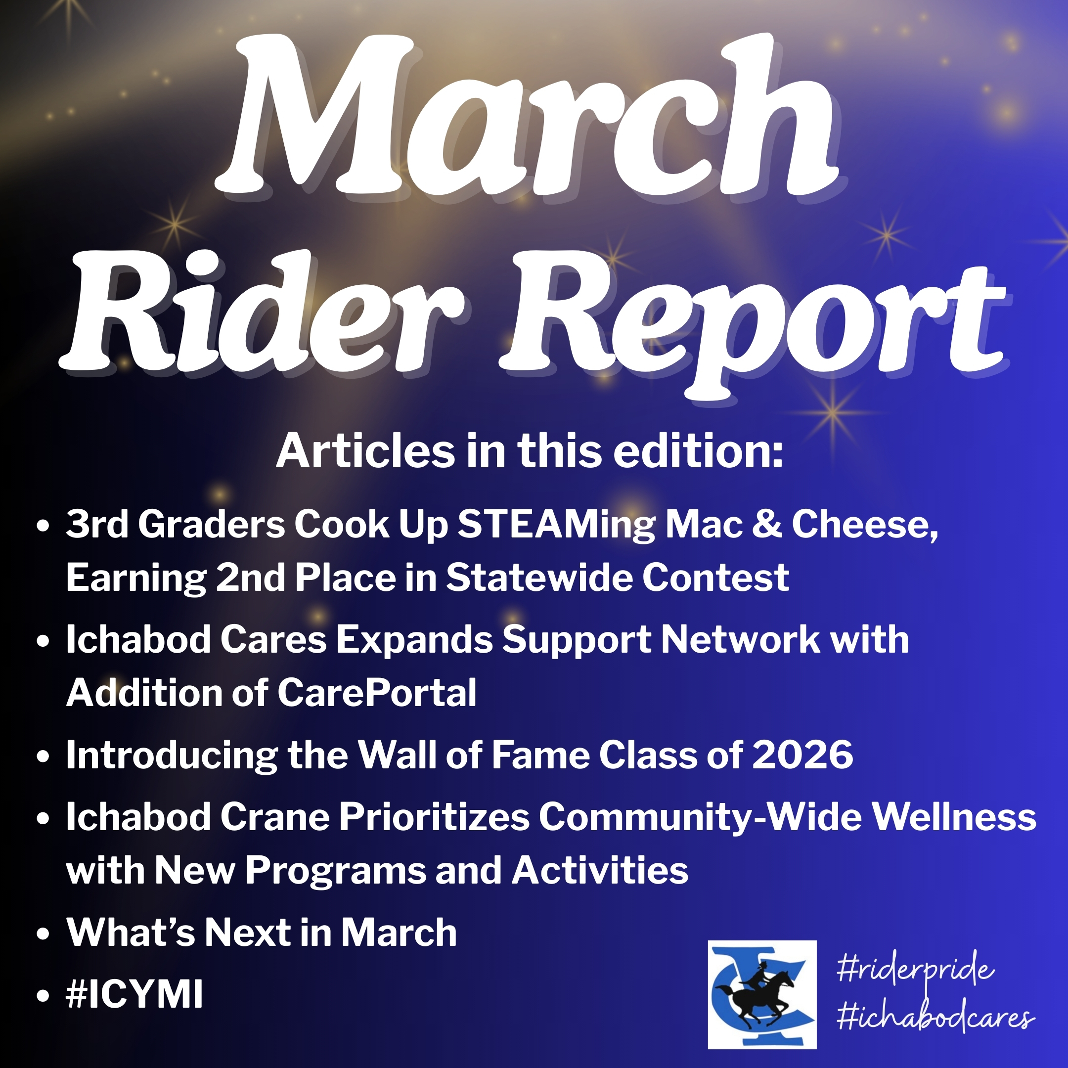 From our third graders winning statewide recognition in the Mac & Cheese Challenge, to the expansion of Ichabod Cares with CarePortal, to announcing the Wall of Fame Class of 2026, there’s so much happening at Ichabod Crane!
